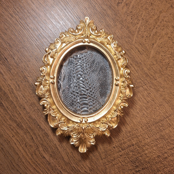 Gouden lijst met slangenvel, kan standaard staan, optioneel ook hangen.