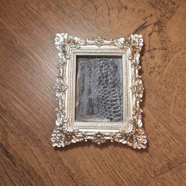 Gouden lijst met slangenvel, kan standaard staan, optioneel ook hangen.